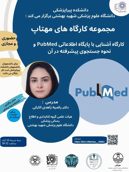به استحضار می رساند مرکز همگرایی توسعه آموزش و پژوهش (مهتاپ) دانشکده پیراپزشکی در نظر دارد کارگاه آموزشی «آشنایی با پایگاه اطلاعاتی PubMed و اصول جستجوی پیشرفته در آن» را با تدریس سرکار خانم دکتر زاهدی، استادیار کتابداری و اطلاع رسانی پزشکی، به صورت حضوری و مجازی برگزار نماید.