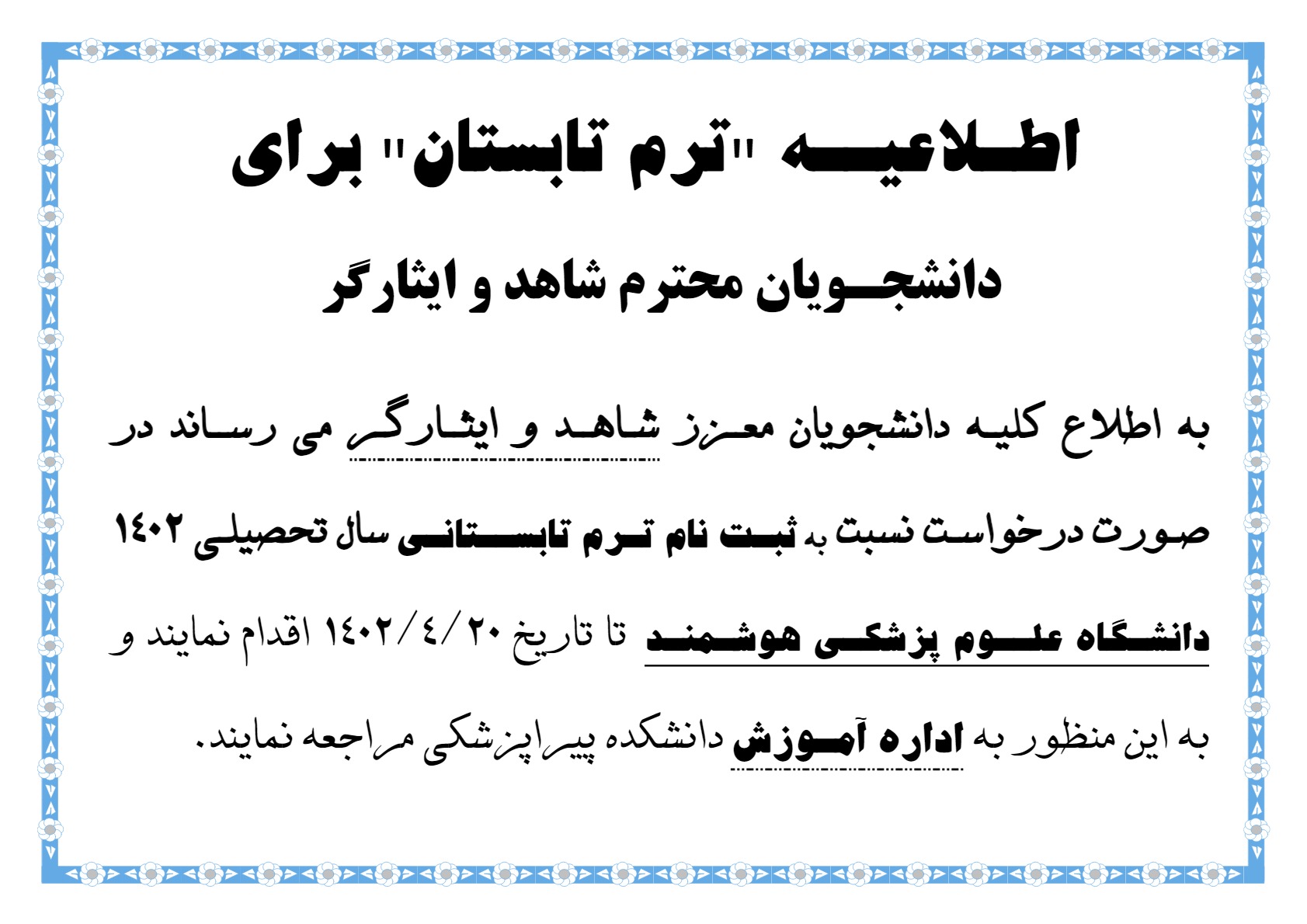 ترم تابستان برای دانشجویان محترم شاهد و ایثار گر