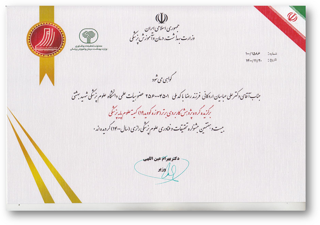 در این جشنواره دانشکده پیراپزشکی دانشگاه علوم پزشکی شهید بهشتی موفق به کسب یک جایزه برگزیده پژوهش کاربردی برتر حوزه کووید۱۹توسط دکتر علی عباسیان اردکانی شد.