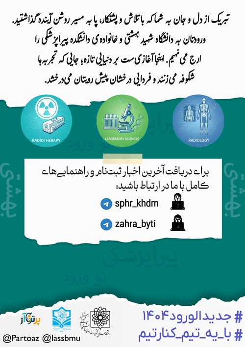 قابل توجه همه نو ورودی ها ، همزمان با اعلام نتایج کنکور سراسری ، اعضا و منتور های انجمن اسلامی دانشکده پیراپزشکی شهید بهشتی در حوزه های صنفی ، علمی و رسانه ای جهت تسهیل روند ثبت نام حضوری و غیر حضوری آماده پاسخگویی و پشتیبانی نوورودی های گرامی هستند
