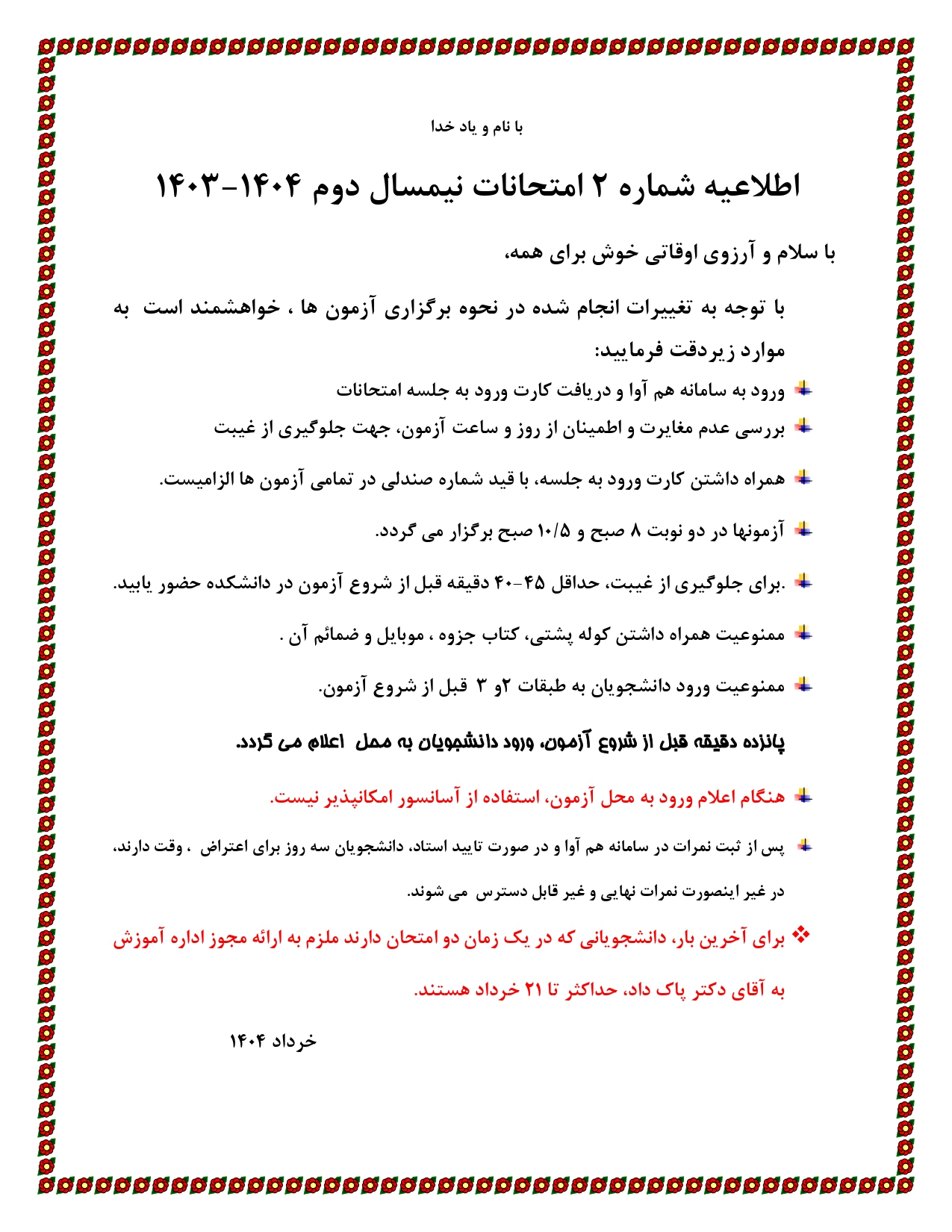 اطلاعیه دوم امتحانات نیمسال دوم 1404-1403 اطلاعیه دوم امتحانات نیمسال دوم 1404-1403 گروه خبری : اطلاعیه های آموزشی,اطلاعیه های برنامه ریزی و امتحانات کد خبر : 157228 لینک کوتاه کلید واژه